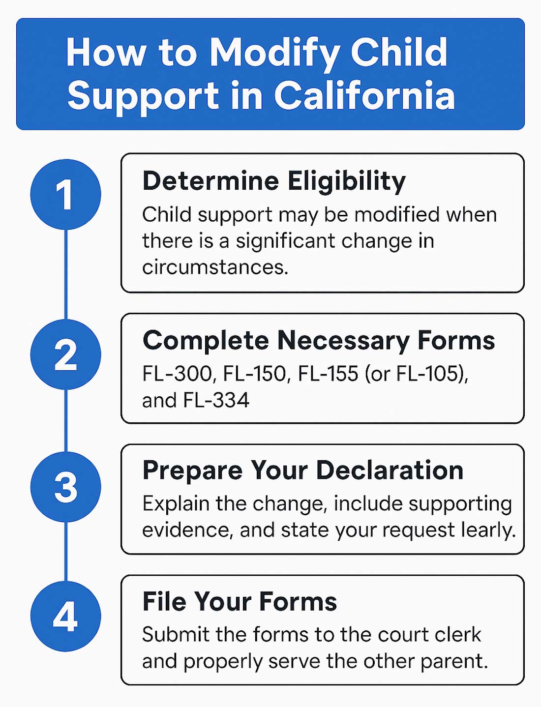 Parents in California can request a change in child support when their financial or caregiving circumstances shift. But you can’t just agree on a new amount and move on. You need to file the necessary paperwork and follow the court’s procedure.